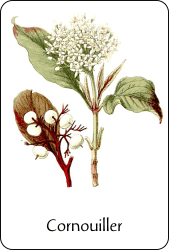 - Cornouiller blanc (Cornus alba), aussi appelé Cornouiller de Tartarie, famille des Cornacées. Grand buisson ou arbuste. Il est connu sous le nom anglais de dogwood « bois du chien ».