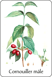 - Cornouiller mâle (Cornus mas), ausssi appelé Cornouiller des bois. Grand arbrisseau. Ses fruits sont comestibles et ont des vertus médicinales.