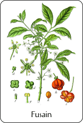 - Fusain d’Europe (Euonymus europaeus), aussi appelé Bonnet de prêtre ou d’évêque, Bois à lardoire, famille des Célastracées. Arbuste ou petit arbre (3 à 8 m). Feuillage, rouge en automne, très esthétique. Se multiplie facilement par semis, bouture ou marcotte. Toutes les parties de la plante sont toxiques, mais le bois carbonisé est un des outils préférés des dessinateurs. Il était utilisé pour la fabrication de la poudre et servait aussi à fabriquer les FUSeaux.