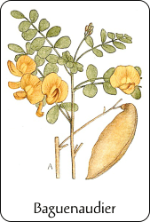 - Baguenaudier (Colutea arborescens), aussi appelé arbre à vessies, famille des Fabacées. Arbrisseau (0,5 à 1 m) très ramifié. Ses gousses gonflées et translucides, les baguenaudes, faisaient la joie des enfants qui s’amusaient à les éclater en se « baguenaudant ».